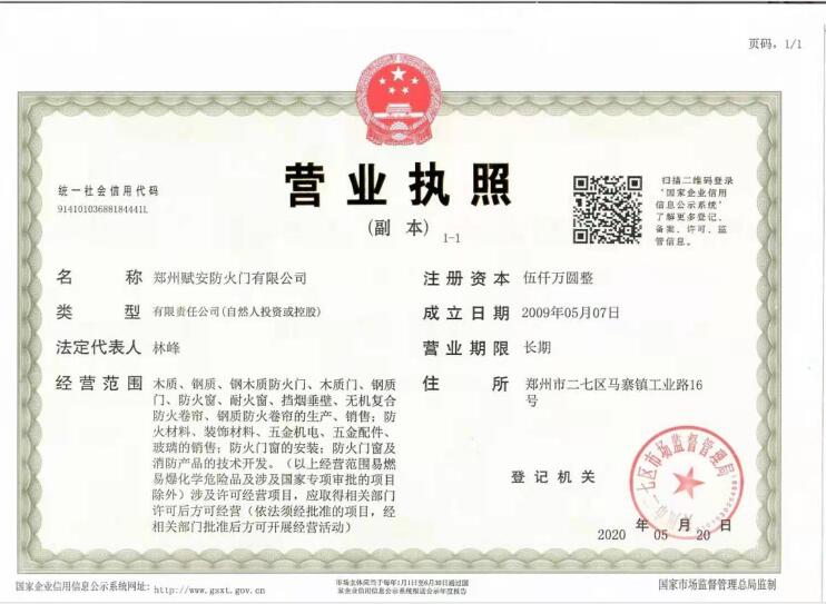 河南賦安消防器材有限公司、鄭州賦安防火門有限公司創立于2005年,獲得應急管理部消防產品合格評定中心認證企業。公司集防火門窗產品研發、生產、銷售、施工為一體的現代化企業。公司依靠嚴格的生產管理體系、質量體系、售后服務體系使產品一直走在市場的前列。公司以“誠信為根、質量為本、服務至上”的服務宗旨,遵循“品質造就品牌”的發展思路,秉承“品牌興企”、“品質興企”、“管理興企”三大舉措不斷提升自身的核心競爭力。 廠區位于原陽縣產業集聚區,占地面積35000平方米,注冊資金5616萬元,固定資產8000萬元,公司員工約300人。公司有多年的防火門窗系列產品生產經驗,技術力量雄厚。擁有真空阻燃防腐設備,激光切割機,多功能熱壓機等國內先進的流水生產線。生產工藝先進,質量理體系完善,年生產能力 80 萬平方米,公司主營產品 : 木質防火門、鋼質防火門、防火防盜門、鋼木質防火門、防火窗、鋼制防火卷簾、無機布防火卷簾、擋煙垂壁等防火門窗系列產品;所有系列產品均取得應急管理部消防產品合格評定中心認證。 長期以來公司在全體員工的共同努力下,以軍隊化作風指導,嚴格生產管理,完善的質量體系,良好的售后服務使產品走在市場的前列,曾先后獲得“河南十大門業品牌”、 “中國防火門十大品牌”、 “誠信3.15質量服務雙優示范單位”、市技術監督局頒發的“質量管理達標企業”、“全國鄉填 企業基礎工作達標一級企業”、 “省質量信得過產品”,并于 2021 年在防汛救災工作中獲得愛心企業等稱號!我廠愿在不 斷發展和完善的過程中重視科技,以人為本,堅持“創優質產品,做誠信企業”的宗旨,為我國消防事業貢獻一份力量! 至真至誠的賦安人愿意與各界朋友攜手共進,共同發展,以大中國,大世界的超前眼光,永立市場經濟的潮頭,昂首闊步走向更加輝煌的明天。...